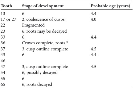 It cannot be ascertained whether the first permanent molars were erupted or not. From the stages of tooth development, the juvenile was probably aged around 51 ⁄2 years of age, ±15 months (Table 3.126).