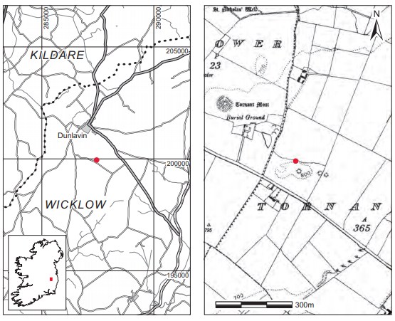 The site was in the townland of Tornant Upper in west County Wicklow, close to the border with County Kildare.95 It lay on the northern side of an esker ridge that runs west/east in a field adjoining the road close to the landowner’s residence. On the summit of this esker is an earthen mound. On or beside this mound was a decorated stone and to the east of the mound at a lower level was an earthen platform, originally encircled by a ring of stones. A cist containing a bowl is recorded from the neighbouring townland of Tornant (Walshe 1931; Price and Walshe 1933; Price 1934–5).96