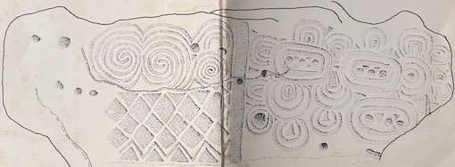 On the rear vertical edge of the basin, circle, and dot-and-circle motifs had been carved. The circles had first been carved by using a pointed chisel and mallet; they were then rubbed with a pebble to smooth out the chisel marks so as to achieve smooth if not quite polished grooves. This is a technique which was used also on K1, the Entrance Stone of Newgrange itself and on K52, the stone diametrically opposite.