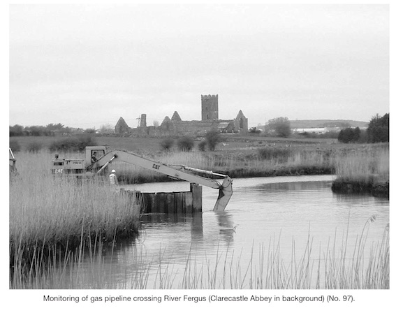 As part of Bord Gáis Éireann’s Gas Pipeline to the West, monitoring of the excavation for a pipe trench beneath the River Fergus was undertaken. The monitored trench was 3.6m wide and 40m long. Mechanically excavated riverine deposits were scanned visually and a metal detector was used. River silts, alluvial peat and clays were observed. No deposits or features of archaeological significance were found.
