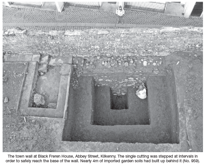 The walls of Abbey Street form some of the most impressive survivals from Kilkenny’s town wall and the adjoining ‘Black Freren Gate’, which gave access into the Dominican precinct from the Hightown, is the last remaining gate in the circuit. A single cutting was excavated inside the wall, in the raised garden to the rear of the Georgian ‘Black Freren House’, a dwelling that was inserted into the garden of a ‘two-perch’ medieval burgage plot.