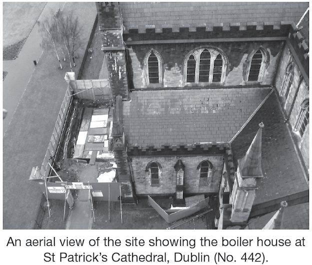 Monitoring works were carried out during the recent conservation project at St Patrick’s Cathedral, Dublin. These works, under conservation architect John Beauchamp, included the repointing of the medieval Minot tower, the upgrading of the heating system within the cathedral (with the replacement of the external boiler house, on the north side of the northern transept) and the insertion of floodlights on the southern side of the cathedral.