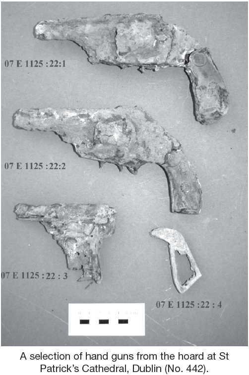 One of the more interesting finds was from a second pipe, which was also orientated east–west along the northern side of the boiler house, between it and the wall mentioned above. At the eastern end, the pipe contained a hoard of guns, which had evidently been hidden or disposed of sometime in the early 1920s, presumably during the Civil War. The cache included two revolvers, a small automatic pistol and part of a handle frame of another gun, possibly a revolver. The automatic pistol was located c. 0.7m from the eastern end of the pipe but the magazine and trigger were almost completely corroded and the magazine spring was loose. The two revolvers were located c. 1.4m to the west of the automatic pistol. They were stuck together and were heavily oxidised with both triggers almost completely corroded. The loose clay around a broken section of pipe produced part of a handle of a fourth gun, which is likely to have originated in the pipe also. The fall of the pipe, 2m below present ground level, was from east to west (or from Bride Street to Patrick’s Street) the base of the pipe was c. 0.1m lower at the west end. This may suggest the guns were put in somewhere east of the boiler house but very close by. A CCTV survey was carried out to establish if there were additional guns and this extended for c. 5m to the east beyond the excavation limit. Unfortunately, the camera could not go any further as the pipe was either blocked or there was a U-bend. The survey was also carried out on the western side but the pipe was blocked at this end although it probably fed into a manhole located to the west of the north-west corner of the boiler house. It is highly likely that the manhole fed directly into an underground and culverted stream (a branch of the Poddle) that is still active, orientated east–west and parallel to the cathedral.
