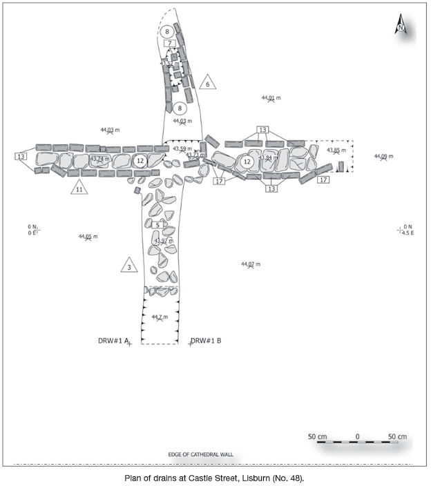 The demolition of two terraced houses within the conservation area for Lisburn in July 2009 resulted in a two-day excavation at the rear of the buildings. A portion of a brick-built drain, a brick culvert and a stone drain were uncovered. These drains appeared to have been contemporary with the 19th-century buildings that were demolished.