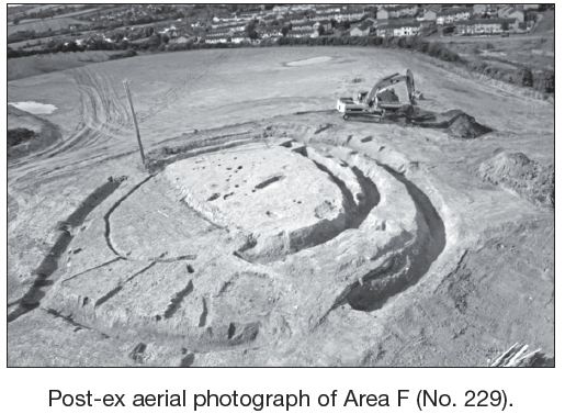 Area A was a collection of five pits and a single stake-hole with associated flint artefacts. A scattered group of six pits was uncovered in Area Bi. Sherds of carinated bowls were recovered from some of the Postex aerial photograph of Area F (No. 229). pits. Area Bii has only been partially excavated. Excavation revealed a pair of concentric slot-trenches that are interpreted as the remains of a house, c. 15m in diameter. From details visible on the surface, it appeared that the structure had a central hearth and an internal wall-slot. The external slot-trench is currently interpreted as a ‘drip-trench’ for conveying water away from the structure. Excavation and recording of the internal features is largely complete. These comprised several dozen stake-holes, the remains of various internal divisions and a number of structural post-holes. Approximately one-third of the enclosing elements have been excavated.