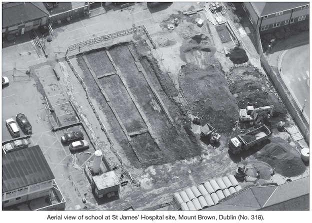 Testing was carried out at the site of a proposed radiotherapy treatment facility at St James’ Hospital, which is located at Mount Brown, Dublin 8. Three test-trenches were excavated across the proposed development area during February 2009. The testing uncovered the remains of three north-northwest/south-south-east-running walls (Walls A–C) which were encountered in each of the three trenches. These walls represent the remains of a 19th-century school which is first depicted on the second-Aerial view of school at St James’ Hospital site, Mount Brown, Dublin (No. 318). edition OS map of 1846. The school was constructed in the late 1830s or early 1840s and demolished in the first half of the 20th century.