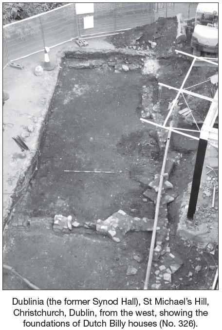 The excavation exposed the remains of two late 17th/early 18th-century Dutch Billy houses that fronted on to St Michael’s Hill, on the western side of the site. The remains of the main walls and a central chimney stack, containing four triangular chimneys, survived to at least 0.6m in depth, with evidence of a laneway and yard in the central area, extending to the east. The south-east corner of the excavation, however, exposed medieval organic deposits lying just 0.3m beneath the yard level, suggesting that there were no post-medieval cellared buildings in this location. A service trench established that these deposits were at least 2m in depth with evidence of a substantial hearth, perhaps suggesting the presence of a house in this location, dated to the 11th or early 12th century (Hiberno-Norse levels). What was also established was that this area was outside the graveyard attached to the medieval church of St Michael.