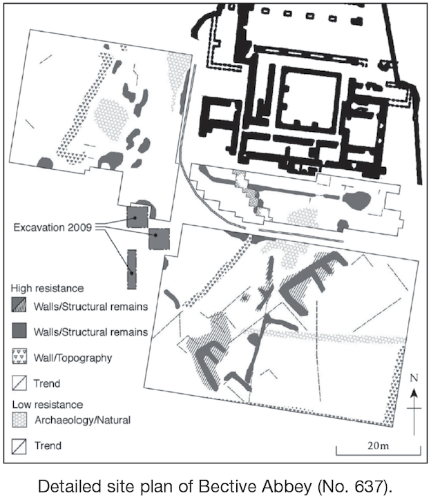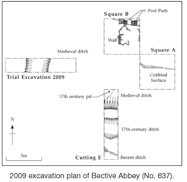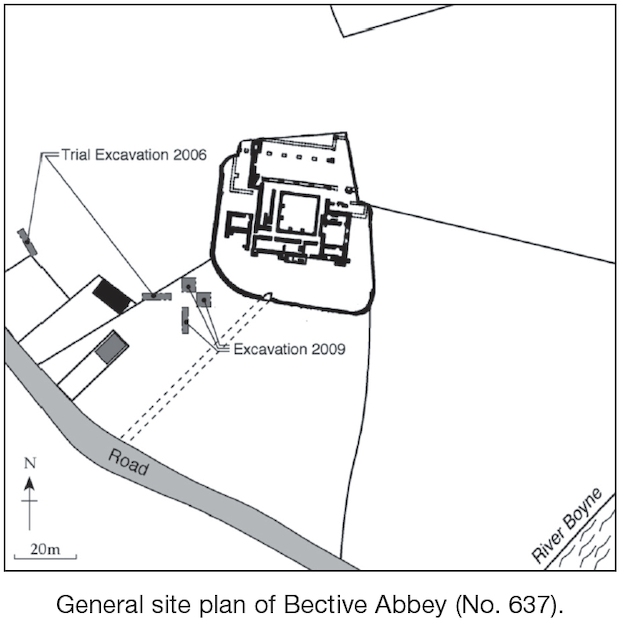 A research excavation was carried out within the southern precinct of Bective Abbey, Bective, Co. Meath, in July 2009. The site is located c. 0.7km south-east of the village of Bective and c. 6km southwest of Trim. Bective Abbey is a national monument (ME031–026). Excavation over four weeks revealed two main phases of activity of medieval and post-medieval date, the former represented by the southwestern corner of a building with an external drain and enclosed by a medieval ditch and the latter represented by a demolition event, erection of a property boundary and a single burial of human remains.