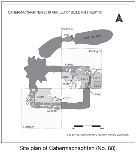 The focus of the excavations was a small building positioned immediately north-west of Cabhail Tighe Breac and a cutting opened in Cabhail Tighe Breac during the 2008 season which was completed (see No. 89, Excavations 2010, 10E0147). The excavations took place from 16 June to 16 July as a training exercise for archaeology students of NUI, Galway.
