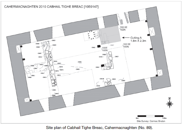 Excavations at Cabhail Tighe Breac from 2007 to 2010 have established that the buildings in the settlement are not all contemporary. Cabhail Tighe Breac appears to have been built first, probably as the O’Davoren schoolhouse, c. 1500, but it underwent modifications in the post-medieval period, during which it was used as a residence. The buildings excavated in 2007 and 2010 reused stone fittings from Cabhail Tighe Breac and appear to have been constructed in the mid-17th century after Cabhail Tighe Breac was refurbished as a dwelling.