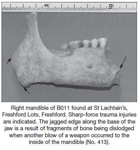 Two of the skeletons (B11 and B12) were of particular interest. B11, a male of 25–45 years old, exhibited injuries consistent with a frenzied assault with a blunt-force weapon. The skeletal evidence suggests that the individual had suffered at least ten individual injuries on the cranium and mandible, with injuries also present on the first and second cervical vertebrae. He had also been incompletely decapitated. The second individual, B12, lay beside B11 and was an adult (further sexing and ageing was not possible) that had his right arm severed at the time of death. The age of both these skeletons is not known at the time of writing—radiocarbon dates are awaited—but it is tempting to associate them with the famous three-day battle of Achadh-Úr that took place near Freshford in 1169 between the combined forces of Irish, Norman and Wexford Norse troops under Diarmait Mac Murchada and the troops of the Mac Gilla Patric King of Ossory.