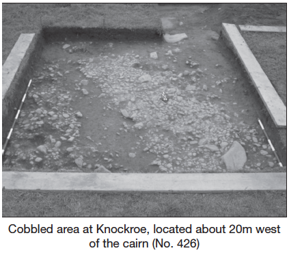 Excavations west of the site revealed a cobbled area with some associated artefacts, including fragments of metal and broken honing stones that were not sufficiently diagnostic to establish a date. The cobbling may represent the edge of an industrial or domestic area of broadly medieval date and may be linked with traces of equivalent activity at the eastern edge of the cairn. Small-scale investigations associated with conservation works did not reveal any meaningful evidence.
