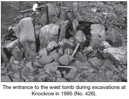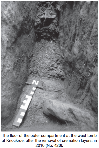The most informative archaeological layers were encountered on the floor of the west tomb and around the entrance. In the inner of the three tomb compartments a substantial quantity of cremated bone was recovered from gaps between the orthostats and the floor slab. This was interpreted as the remains of cremation deposits removed in previous seasons. Similar residual deposits were recovered from the middle compartment of the tomb and the remains of one previously undisturbed deposit were also recovered. A significant number of previously undisturbed cremation deposits were encountered in the outer compartment of the tomb, both in the gaps between structural stones and as layers interspersed with small boulders on the paved floor of the compartment. As boulders left undisturbed in 1995 were lifted, further deposits of cremated bone were removed from the platform surface immediately in front of the west tomb. While most cremation deposits inside and outside the tomb were mixed with varying amounts of soil, some pockets of bone were cleaner and distinguishable from the surrounding material. Classic passage tomb artefacts were recovered from the cremation deposits: pendants, beads, tubular spacers, fragments of bone and occasionally antler pins. Post-excavation scrutiny and sieving of the cremated bone produced many additional artefacts, generally of a fragmentary nature. As part of the conservation of the site, two orthostats were temporarily lifted from their sockets on the right side of the west tomb, revealing further concentrations and residual scatters of cremated bone in gaps between structural stones. This indicates that an unknown amount of cremated bone remains unrecorded in hidden gaps amongst the floor stones and orthostats of the tomb.