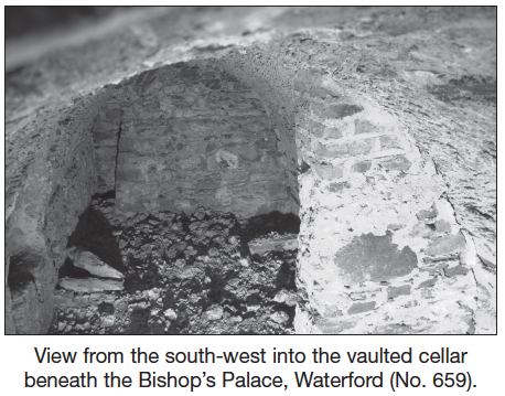 The Bishop’s Palace on The Mall, Waterford, was built in 1743 over the site of an earlier palace. The present building was subsequently used as Bishop Foy’s School, and up to recently functioned as an administrative building of Waterford City Council. The building is now undergoing complete conservation and restoration and will house a museum dedicated to the post-medieval history of the city of Waterford. All subsurface works have been and continue to be monitored. To date the most significant discovery is that of an earlier vaulted cellar beneath the north-eastern room. The vault was stone-built with a wicker-centred roof. The north-western wall has a niche, or wall cupboard. There are at least four steps leading downwards from the cellar to below the terrace outside the building. The doorway at the base of the steps is brick-built and backfilled with loose rubble. The vault was not entered but was measured by laser. A lamp was inserted and photographs were taken with the aid of an inverted tripod. The breach to the vault was repaired and the room is at present sealed. It is hoped to be permitted under the ministerial consent to further investigate the entrance, which must exist between the city wall and the Bishop’s Palace. It is possible that the vault pertains to the earlier palace.