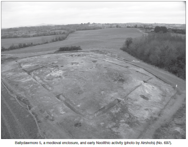 A third phase on the site is represented by a medieval enclosure and annexe. A small number of sherds of pottery were recovered from the fills of the rectangular enclosure ditch and were identified by Niamh Doyle as Leinster cooking ware or a local derivative. At the terminus of the western entrance to the annexe to the enclosure, an entire large pot of identical pottery appears to have been broken in situ.
