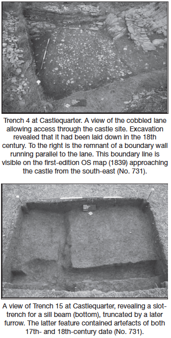 The next cutting, Trench 6, was opened to ascertain if the castle defences extended to the edge of the river terrace on which the castle site is situated. Excavation of this trench only revealed natural subsoils, with no indication of perimeter castle walling or external fosse. Trenches 7–12 were opened to ascertain if further evidence of the castle complex remained on the rock outcrop, on the other side of the quarry, opposite to where castle remains have been uncovered. Excavation of Trenches 7–10 revealed that a significant amount of quarry debris (up to 2.5m in depth) had been deposited over the surface of the rock outcrop. Unfortunately, no features or artefacts of archaeological significance were uncovered in these trenches. Excavation of Trench 11 revealed an expanse of shale bedrock, the undulations of which were filled with natural subsoils, with the exception of one. This appears to have been a deliberately cut cleft in the bedrock that was backfilled. It also contained a post-hole that was burnt in situ. Among a small number of artefacts recovered from the topsoil was a possible sherd of late 17th-century Buckley ware. There appears to have been limited soil development above the bedrock in this particular location, which may preclude the survival or indeed presence of archaeological deposits. No other post-holes or archaeological features were uncovered. Excavation of Trench 12 revealed a series of garden furrows which, on examination, proved to be shallow cuts with slightly rounded bases. No artefactual material was recovered from the fills. According to local information, gardening was carried out in this area in the mid-20th century.