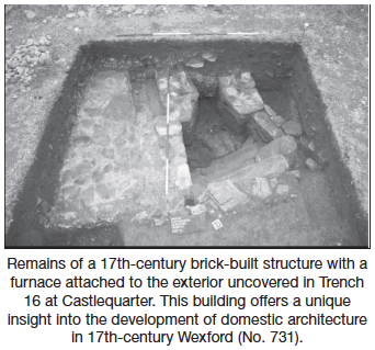 Trench 16 uncovered the remains of a brick-built building of 17th-century date with an attached furnace. As exposed in the trench, the brick structure measures 2.25m by 1.23m externally. The brick wall, bonded with a lime-based mortar, survives to two courses in height with the bricks laid in English bond; i.e. a row of headers followed by a row of stretchers. The interior was covered with shale flagstones heavily bonded with a lime-based mortar. This structure probably served as a bake house for the occupants of the manor house and/or village. Many household inventories of the period record the presence of ancillary buildings such as washhouses, dairy houses and brew houses. The same 1660 lease of Clohamon indicates that there were a number of outbuildings associated with the manor house. The bakehouse uncovered this season is a unique survival of such a building, as low status buildings, whether in the grounds of manor houses or elsewhere, rarely survive.