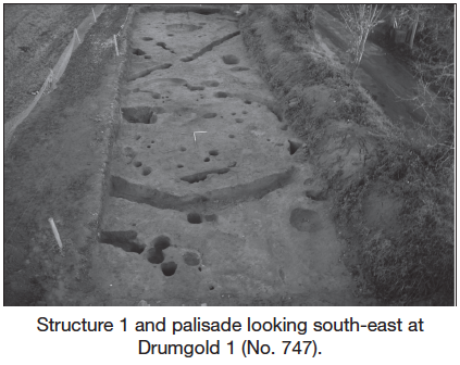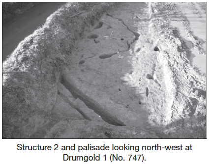 North-west and south-east of Structure 1 were two palisade trenches. The one to the south-east was orientated north–south and was approximately 10.7m long within the site, 0.51m wide and 0.4m deep. A 0.7m gap formed an entrance through the palisade, allowing access to the house, and post-holes were evident in the base of the northern palisade trench suggesting a large gate. Outside the palisade were two parallel lines of post-holes orientated east–west that led towards the entrance.