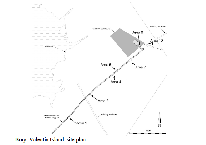 Area 1 was a pre-bog drain cut. The drainage ditch traversed the road-take, south-east/north-west, and was U-shaped in profile, 1.5m wide, 0.6m deep. The next area (Area 3) uncovered a pre-bog field boundary orientated east-west; a length of 5.08m was exposed. The wall measured 1.9m wide and was only 0.25m in height. Clusters of natural quartz pebbles were found beneath the wall. Further down-slope (Area 4), a previously recorded wall (Mitchell’s [1989] wall No. 11) was orientated east-north-east/west-south-west. The peat had not been cut-away as it had elsewhere and a pre-bog field wall of collapsed upright slabs was found set on a plinth of smaller stones on either side: width 1.92m, surviving height 0.6m. Five meters to the north-east, a portion of curvilinear slot trench was found (Area 5). Approximately 1/3 of the probable structure was within the excavated area. The slot was U-shaped in profile, 0.53m wide with steep sides to a base, 0.2m deep. There was evidence of packing within the fills. Area 7 covered an intersection of pre-bog walls where two large walls were found (previously noted as wall No. 12, Mitchell 1989),. The first, orientated west-south-west/east-north-east, was composed of large boulders and was faced on either side by smaller stones; it was 2.35m wide and 0.5m high. This was exposed over a length of 9.1m but did not join the other wall at the east. The second wall was of similar form (0.48m high, 2.3m wide) but had been altered significantly through use. This wall was dismantled at its south-east end but 11.2m was exposed. A small hearth was found in situ beneath a collapsed upright, on what would have been the top of this wall. Two further small sections of secondary walls were also identified as alterations. The second wall extents north outside of the area of excavation and was intersected again (Area 9). Here, the wall was poorly preserved and measured 2m wide by 0.19m in height; exposed for a length of 4.8m. It was again intersected where a utilities trench (Area 10) was inserted at the north-east. A further two pre-bog walls were also found here. While one was very poorly preserved, the other was of the same form as the wall in Area 4, and was seemingly connected to a wall at north (Mitchell’s wall No.13). Three areas (2, 7 and 8) were not archaeologically significant.