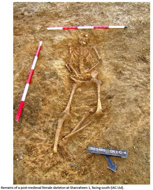 Shanraheen 1 consisted of a single human inhumation and two isolated pits. The skeleton was located to the immediate north of the local road and was aligned north-south, with the head pointing to the south. It was laid out in an extended, supine position with both arms slightly flexed across the body. The left leg was flexed at the knee while the right leg was straight. The remains occupied a ‘scrape’ in the ground, rather than a proper grave cut. This had been truncated by modern ploughing in the area. The remains were identified as belonging to a young adult female (19-25 years). The cause of death was not obvious from the skeletal remains. However, it appeared that little care had been given to her placement in the ground. A sample of fibula was sent for radiocarbon dating and returned a 2 Sigma date range of AD1459–1637 placing this burial in the later medieval or early post-medieval period. It is not clear as to why this young woman was not interred in a graveyard during this period and it is possible that she was a victim of an undiscovered crime.