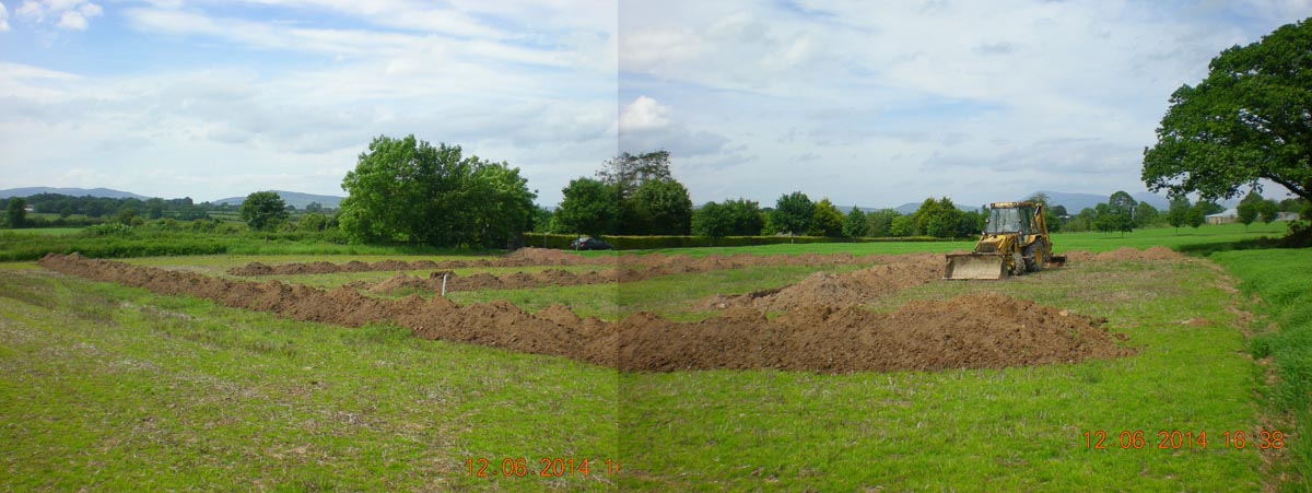 Five trenches were opened across the site, which was rectangular in plan, and measured 67m north-west/south-east by 33.5m. Each trench measured 1.5m in width. No archaeological features were uncovered in Trenches 1 (55m), 3 (20m), and 4 (20m). In Trench 2, which measured 20m in length and was located at the south-eastern end of the site, two possible stake-holes and a charcoal-rich deposit were uncovered near the south-western end of the trench. There had been significant disturbance in this area due to deep digging (1m) associated with the laying of a modern water pipe. In Trench 5, which measured 55m and ran parallel to the south-western boundary of the site, a possible pit was uncovered near the south-eastern end of the trench. This circular feature measured 0.4m in diameter and was uncovered 0.5m below current ground level. This suggests that the southern corner of the site may have previously unrecorded archaeological features. All possible archaeological features, as well as infilled field drains and other agricultural features, were recorded and the trenches were backfilled. The report recommended a buffer zone be established around the possible archaeological features prior to the finalising of the layout of the site and monitoring of the groundworks associated with any further development of the site may still be required.