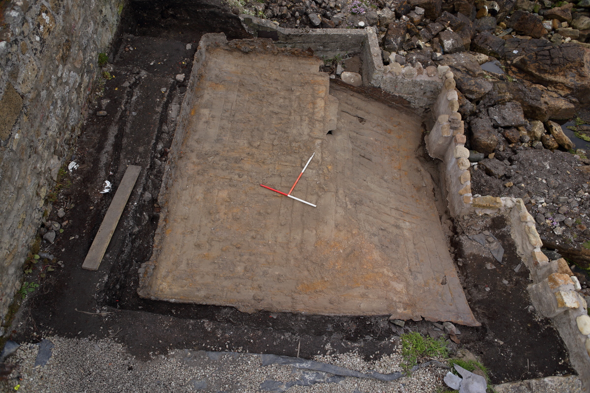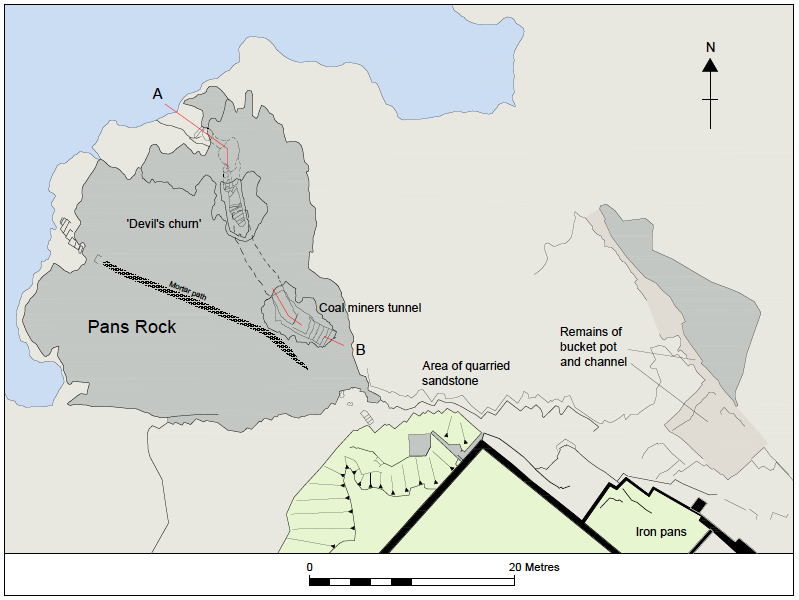 This site had been effected by storm action on the coast and was partially exposed showing damage to a relatively unique industrial survival. The excavation sought to remove the remaining overburden to fully expose and record (in situ) a wrought iron salt pan. Removal of the sod revealed a rich black layer of fine loamy earth containing a mix of modern finds including glass bottles, caps, metal fragments, slate, brick, ceramic and other domestic waste. Below this was a lighter brown loam containing less modern material and more building rubble – principally slate (some featuring nail holes), brick, and roughly dressed stone. The concentration of slate was particularly noticeable toward the wall to the west – obviously this formed the roofing material for the pans, which, as the roof deteriorated, slid down the remaining rafters in this direction. Some ceramics (white glazed and blue and white transfer printed) were also recovered from this context. Below this was the salt pan (5.13m x 4.84m x 0.4m). The pan comprised a series of riveted plates (0.6 – 40mm thick) forming a basin with a rim 0.4m high around the edges (surviving best on the west side, least to the east). The pan has been formed by a line of plates forming two cross members running across each other centrally dividing the pan into quarters. These quarters had been filled by plates being added to form successively smaller squares toward their respective centres. The rim of the pan was formed by a bent plate being added to the edge of the pan, and a further straight one added to gain height. The pan has split (north-south) due to the undermining action of the sea and the north-east portion has collapsed. Examination of the pan surface revealed that repairs had been made in the form of patches and bars. Boiling seawater in iron pans was very hard on the metal and the need for upkeep and maintenance is well documented.