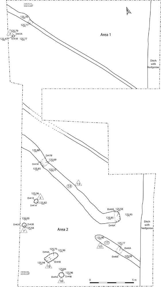 Area 2 contained features associated with two periods of use, Bronze Age and post-medieval. The post-medieval phase consisted of a pair of linear features [C13 and C15], which may be the remains of the enclosure on the 1857 OS map associated with the farm building discussed above, of which there were no remains. The Bronze Age was represented by a series of features, the two pits [C5] and [C10], a hearth [C18] and a post-hole [C7]. The hearth contained a pebble, which had been used possibly as a sharpening stone (Find No. 18), and one of the pits contained flint and pottery indicative of a domestic site. These features were located on the western side of Area 2 indicating a high likelihood of features continuing to the west.