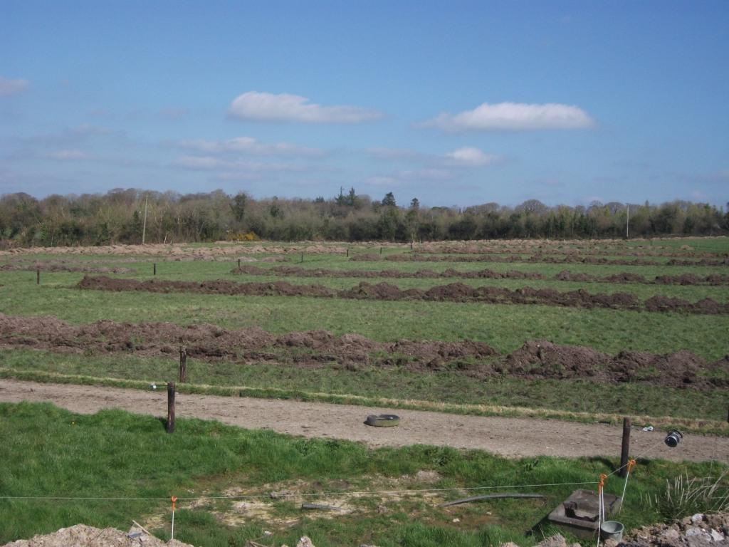 The landowner made a planning application to import soil and stone to raise and improve the output of one of his fields. Due to the presence of two burnt mounds in the vicinity (CO025-106 and -170) test excavation was required. The field to be developed was c.4ha in size, gently north-facing with a large drain along its northern boundary. 16 test trenches were excavated, c.18m apart and c.1400 linear meters in total. The general stratigraphy consisted of between 0.2m and 0.4m of a mid-grey loamy topsoil overlying orange-brown gravels to the east and grey boulder clay to the west, where the ground was noticeably wetter. A number of modern south-east/north-west running drains were noted, otherwise no archaeology was found.