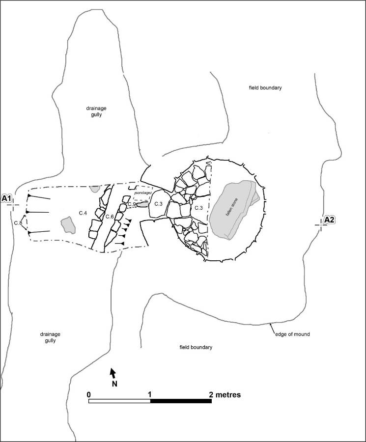 The western half of the interior was excavated, through the entrance, where a 1m wide trench extended out 1.8m. Only deposits above the floor were excavated internally. This found a level flagstone floor, with very thin overlying deposits and only trace indications of burning activity. The flagstones continued through the 0.46m wide entrance. Having both the floor and top lintels of the entrance a min. height of 0.53m was measured. Outside, to west, a wide gully ran adjacent to the field boundary, but only where the sweathouse is located. A series of large stones formed stepping-stones leading up to the entrance. Around the base of these stones, a thin ex-situ burnt deposit is the remnant of burnt material removed from the chamber. Beneath the stepping stone nearest the entrance, a stone-lined drain traversed the trench. This appears to have been used to keep the sweathouse dry but may also have served a pool further downslope.