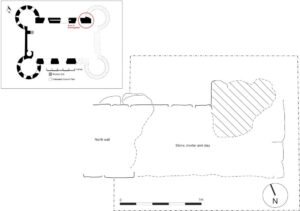 On the basis of the documents submitted a license was issued, with work taking place between September and November 2024. Two small areas were archaeologically investigated as part of the conservation works, the east end of the north wall and the north side of the fireplace in the west wall. Excavations consisted of clearing modern debris to allow for rebuilding and conservation works to take place.