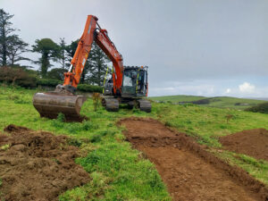 Six trenches were excavated across the subject site proposed for the construction of a dwelling house. The site was a pair of hilly fields field under short grass, adjacent to Ennistymon District Hospital (formerly Ennistymon Union Workhouse No archaeological features were encountered. A metal detector (25R0370) was used on the spoil from the trenches. No artefacts were recovered.
