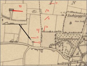 The testing took place over three days from 29 September 2025. For the most part, the geophysical survey proved to be quite accurate and the targeted geophysical anomalies proved to either be agricultural/drainage features or variations in the natural subsoil. In the west end of theĀ southernmost trench (Trench 2), a large deposit of early modern material representing a demolished house was present. This material related to a late 18th or early 19th-century house which was depicted on the first edition OS map of 1842.