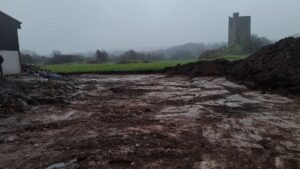 The topsoil was a dry dark brown/black loose peaty/clay with a low density of stone inclusions. Intermixed with the topsoil were pieces of baler twine, bale netting, fragments of plastic and general small pieces of farm waste that had become incorporated into the soil over the years. The depth of topsoil varied across the site but was on average c. 0.3m. The subsoil was a distinct compact light grey clay with a moderate density of stone inclusions. Debris such as twine and bale wrap were noted in the upper 0.1m of the subsoil, presumably driving into the subsoil as a result of rutting/poaching during bad weather and compressed into the soil during rolling. The site had been drained in the past, evident by the three stone-lined drains that were present in the exposed area. The farmer said this part of the field was drained by a herring-bone drainage system with the outlet located in the northern portion of the field.
