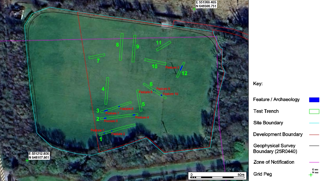 Prior to testing, the site was subjected to a geophysical survey, carried out by Shanarc Archaeology Ltd., under survey licence no. 25R0440. The geophysical survey identified multiple potential archaeological features, primarily in the form of potential pit-type features and several larger areas of concentrated magnetic response.
