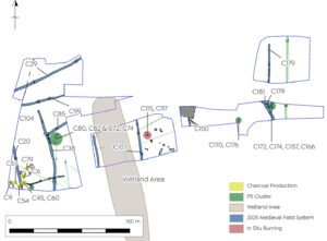 The continuation of the medieval field system (ME044-052—), identified previously during Phase 1 of the development, was also recorded in all areas. A single sherd of medieval ceramic was retrieved from one of the ditches excavated in 2025, however no later material was encountered.