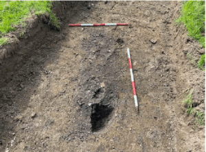 AA1 and AA2 each comprise the shallow remains a circular ditch infilled with a clay rich in animal bone; a figure-of-eight-shaped pit was also identified in the interior of AA1. AA3 comprises the remains of two parallel – or concentric – ditches, which may represent the partial remains of a larger enclosure. The geophysical survey shows these features terminating north and south of the trenches, presumably indicating damage or truncation at a later stage and, as such, the original form of these features is not currently known. AA4 comprises the remains of two circular features. Although these did not initially seem to be concentric, the larger of these ditches does seem to partially surround the smaller. A truncated pit was further identified within the interior of these features. On current evidence these remains could date to the prehistoric or medieval period, and functions could range from domestic to funerary. The remainder of the site contained multiple post-medieval and modern field drains of varying orientations and construction. These included narrow vertical stone-filled drains and wide shallow silt-filled drains.