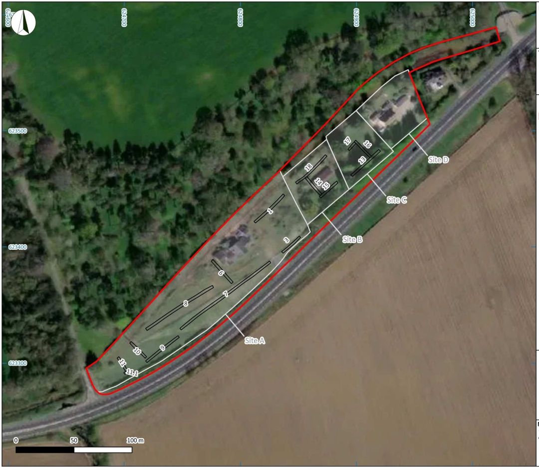 A total of fifteen test trenches were excavated for this assessment in three of the four plots (Sites A, B and C); the proposed development would not have an archaeological impact on the fourth plot. Testing in Site A and B revealed significant modern truncation from land reclamation, with large upstanding spoil heaps recorded across Site A, and modern services recorded in Site B.