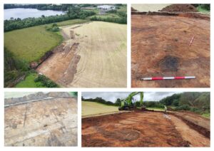 The investigation identified a single area of archaeological activity which was further stripped of topsoil allowing for 10m buffer around each potential feature. The area of activity comprised nine archaeological and potential features including pits, a possible kiln and post-/stake-holes, of which several exhibited high concentrations of charcoal and clear evidence of burning. Following consultation with DfC:HED it was agreed that the appropriate mitigation for these features was preservation in situ. The identified features were subsequently preserved in situ under archaeological supervision, with protective measures implemented to ensure their protection for the duration of the development works. The remaining tested areas of the proposed development displayed consistent evidence of agricultural use, such as plough marks, furrows, and field drains, alongside occasional modern disturbances including landfill, buried waste and construction debris.